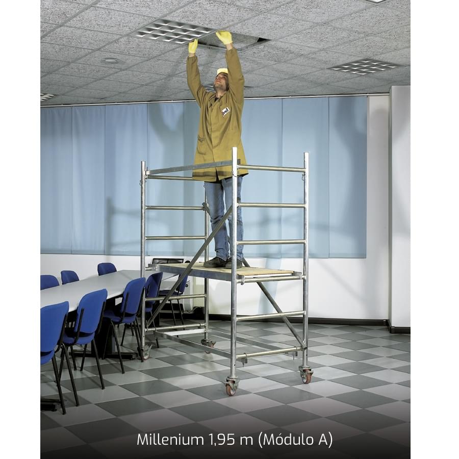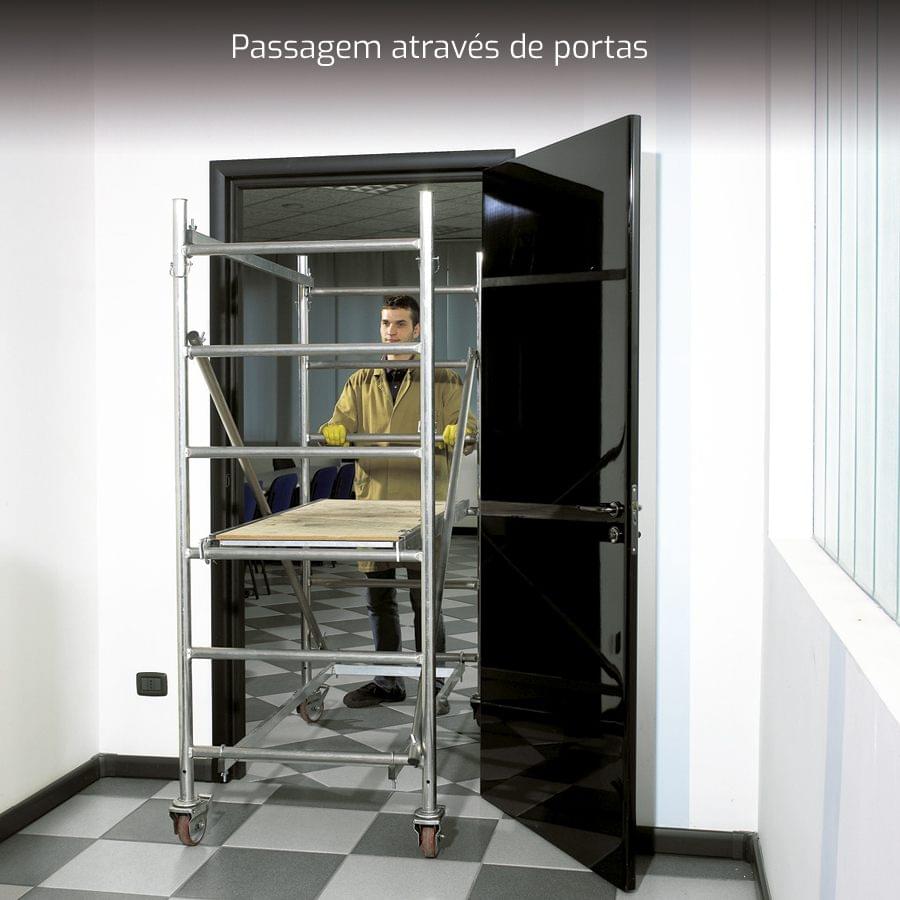 MÓDULO A: 2 marcos de base (6 degraus), 1 estrutura de base com ganchos de encaixe, 2 diagonais, 2 horizontais, 4 rodas giratórias 125mm, 1 plataforma com tampa;