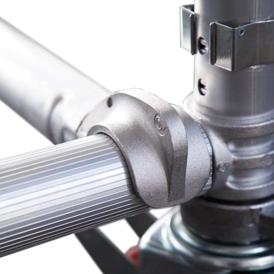 Base automática opcional: base dobrável de abertura e fecho rápido mediante dobradiças. Isto permite um cómodo uso até 4,00 m de trabalho. Usando componentes standard para alturas superiores.