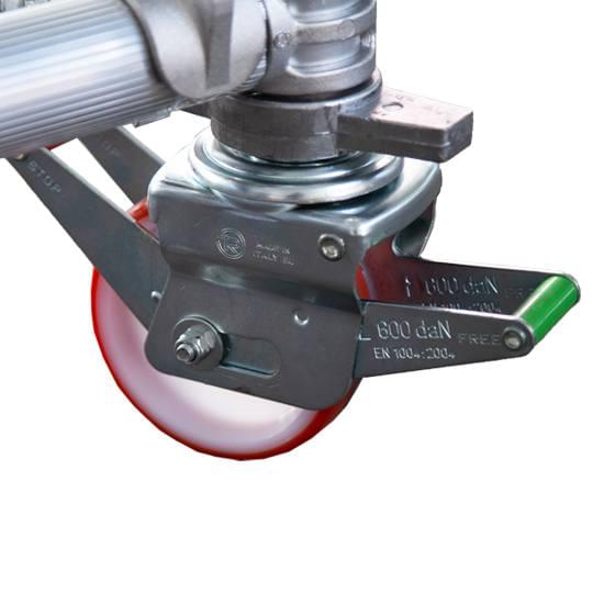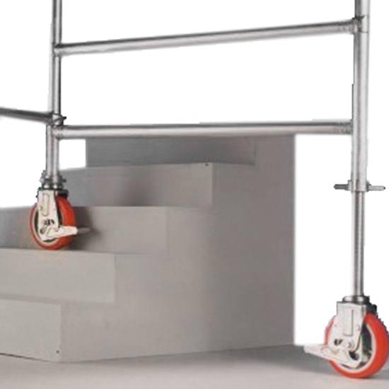 4 rodas de Ø 150mm, 4 pés torneados 400mm, 4 estabilizadores segundo a altura do andaime, 2 horizontais, diagonais em cada módulo com os seus marcos e plataformas de trabalho. As composições fazem-se em altura com o maior número possível de marcos de 2.10m. Os estabilizadores podem ser P, M ou G, segundo a altura do andaime.